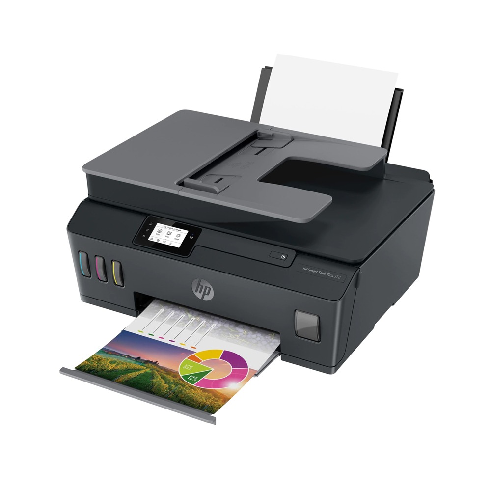 HP Smart Tank Plus 570. Tecnologia di stampa: Getto termico d'inchiostro, Stampa: Stampa a colori, Risoluzione massima: 4800 x 1200 DPI, Velocità di stampa (colore, qualità normale, A4/US Letter): 5 ppm. Copia: Copia a colori, Risoluzione di copia massima: 600 x 600 DPI. Scansione: Scansione a colori, Risoluzione di scansione ottica: 1200 x 1200 DPI. Massimo formato carta serie ISO A: A4. Wi-Fi. Stampa diretta. Colore del prodotto: Nero, Grigio